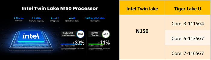 Процессор Twin Lake‑N150 (4 ядра, 4 потока, турбоускорение до 3,6 ГГц) обеспечивает: