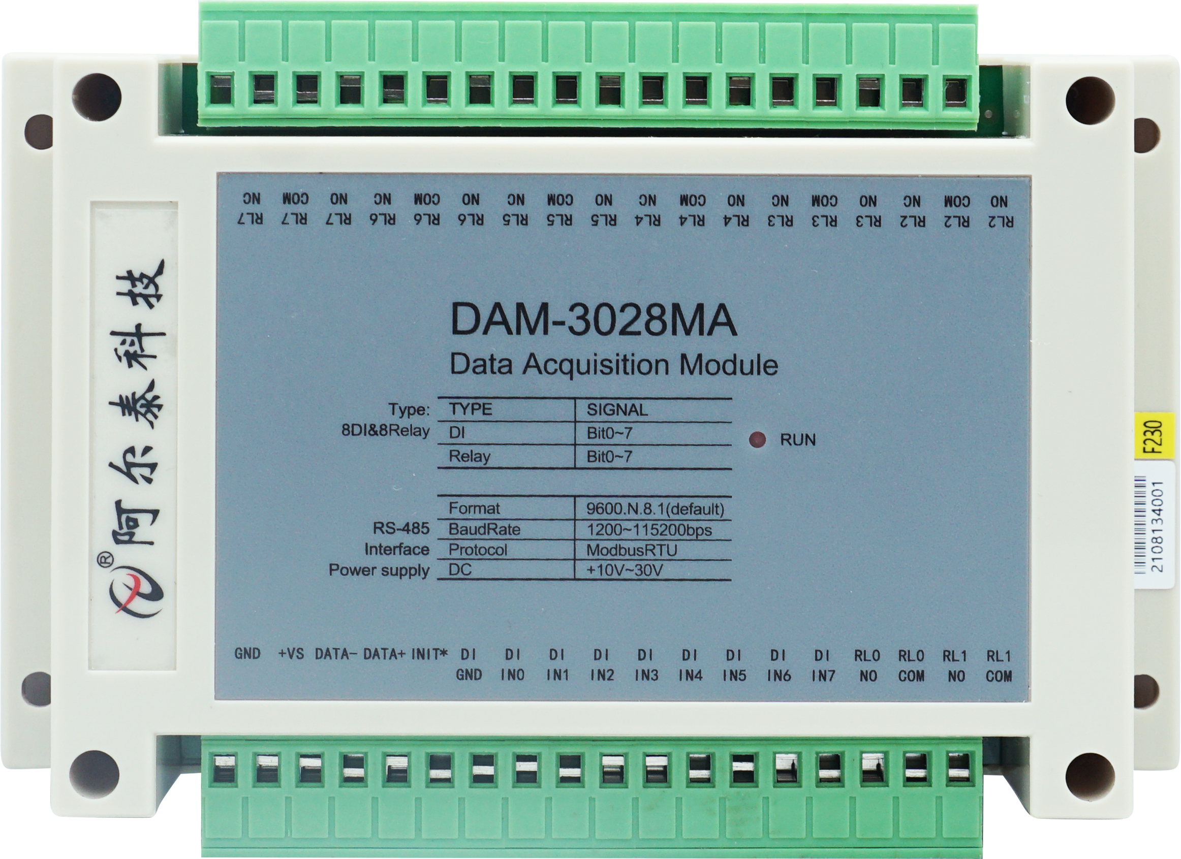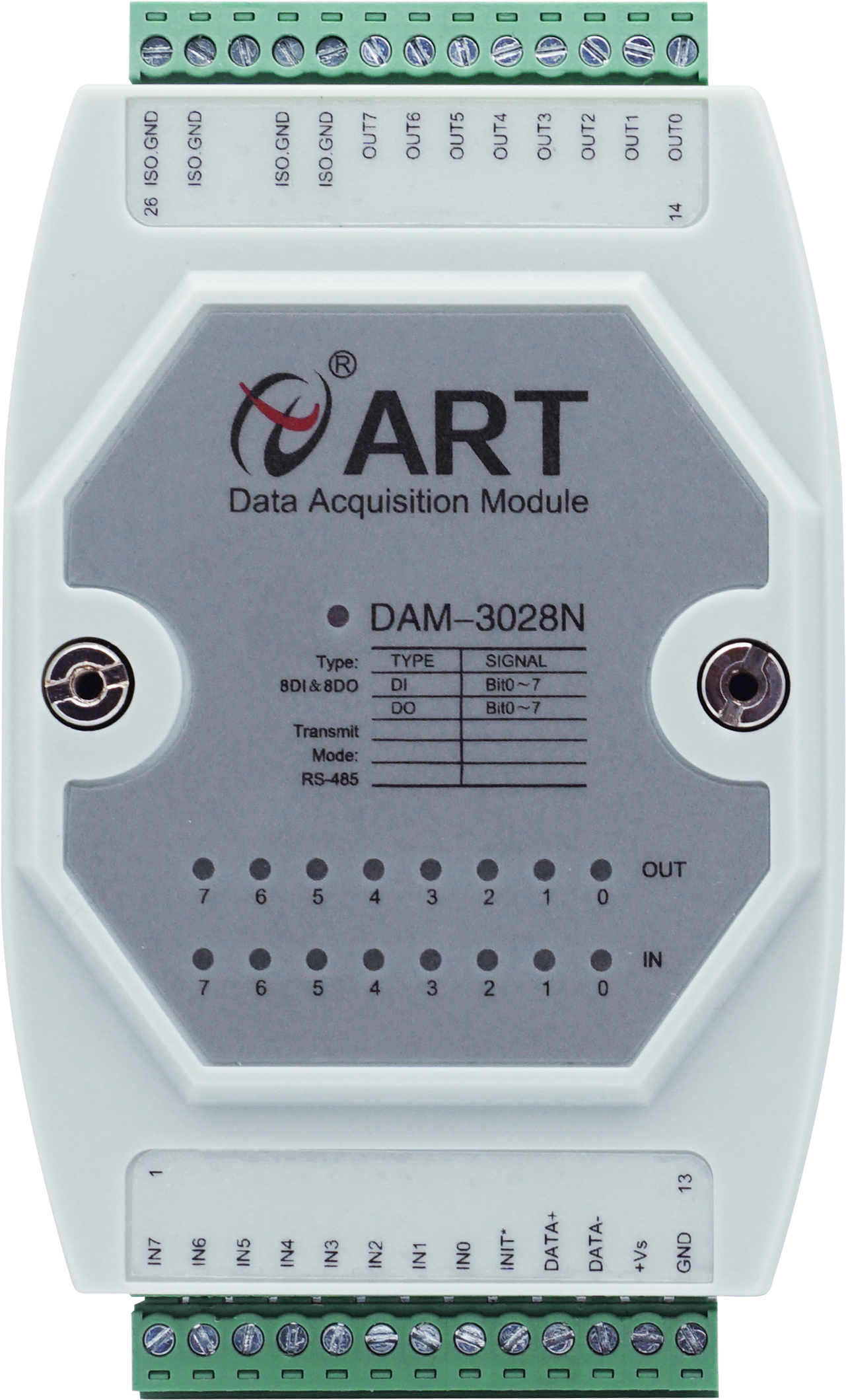 Промышленный модуль DAM-3028C is an 8-channel digital input, 8-channel open collector output module, RS485 communication interface, with standard ModbusRTU protocol. Equipped with a good human-computer interaction interface,